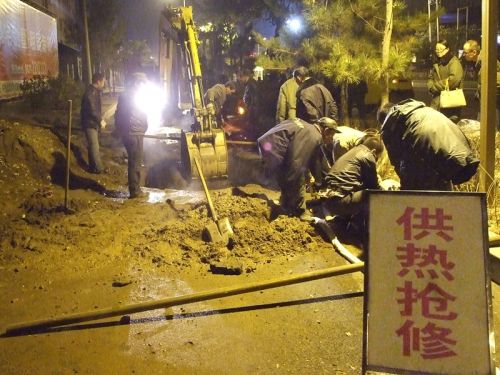 工作人員兵分幾路,對(duì)一次網(wǎng)和熱力站進(jìn)行泄水,同時(shí)在跑水地點(diǎn)進(jìn)行開挖,并將水抽干,待破損管網(wǎng)露出后,按預(yù)定技術(shù)方案進(jìn)行更換和焊接。時(shí)值入冬,夜間溫度已在零下,相關(guān)領(lǐng)導(dǎo)及搶修人員一直在現(xiàn)場(chǎng)工作,無人休息,毫無怨言。在寒風(fēng)中工作人員咬緊牙關(guān),爭(zhēng)分奪秒,連續(xù)奮戰(zhàn)了10多個(gè)小時(shí),終于在第二日凌晨7時(shí),成功將跑水事故處理完畢,并于12時(shí)恢復(fù)了熱力站正常運(yùn)行。