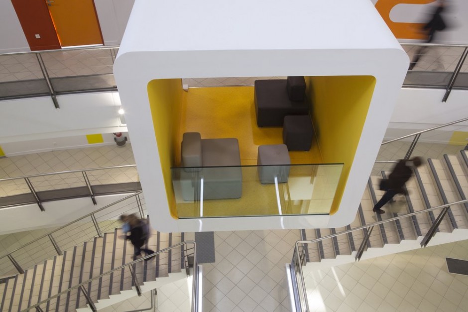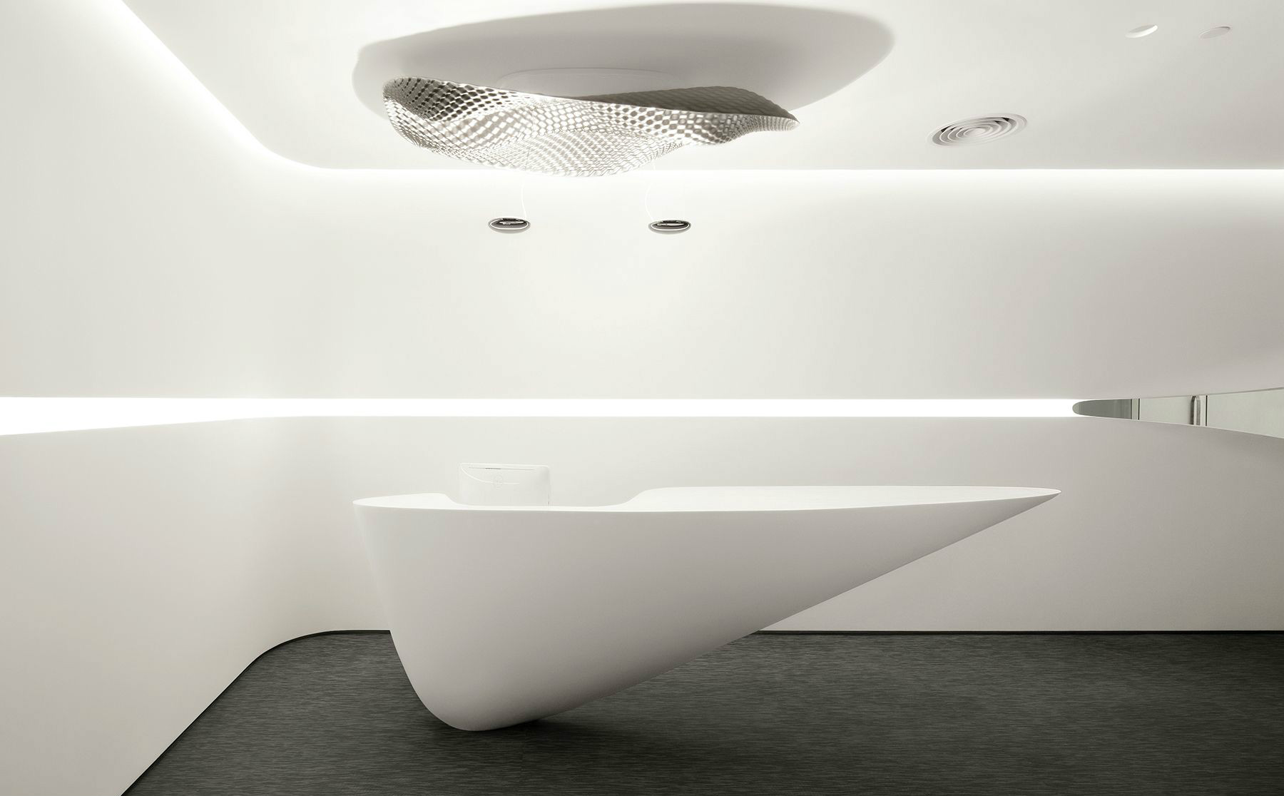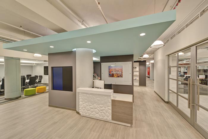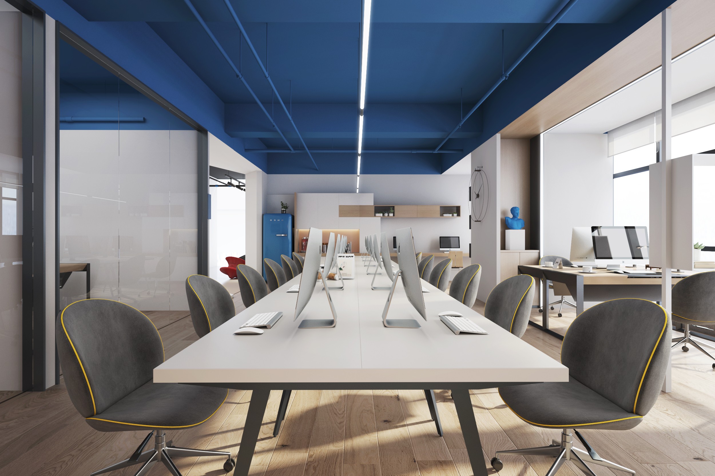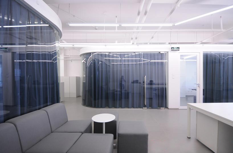 4300平米醫(yī)療公司辦公空間設(shè)計(jì)布局,平靜的色彩、柔軟的面料和以類(lèi)似色調(diào)選擇的彎曲形式提供了所需的寬敞和平靜的氛圍。彎曲的墻壁從入口連續(xù)延伸,增強(qiáng)了空間的連續(xù)性,并通過(guò)在墻壁內(nèi)創(chuàng)建的彩色壁龕創(chuàng)建了咖啡店區(qū)域等功能區(qū)域。